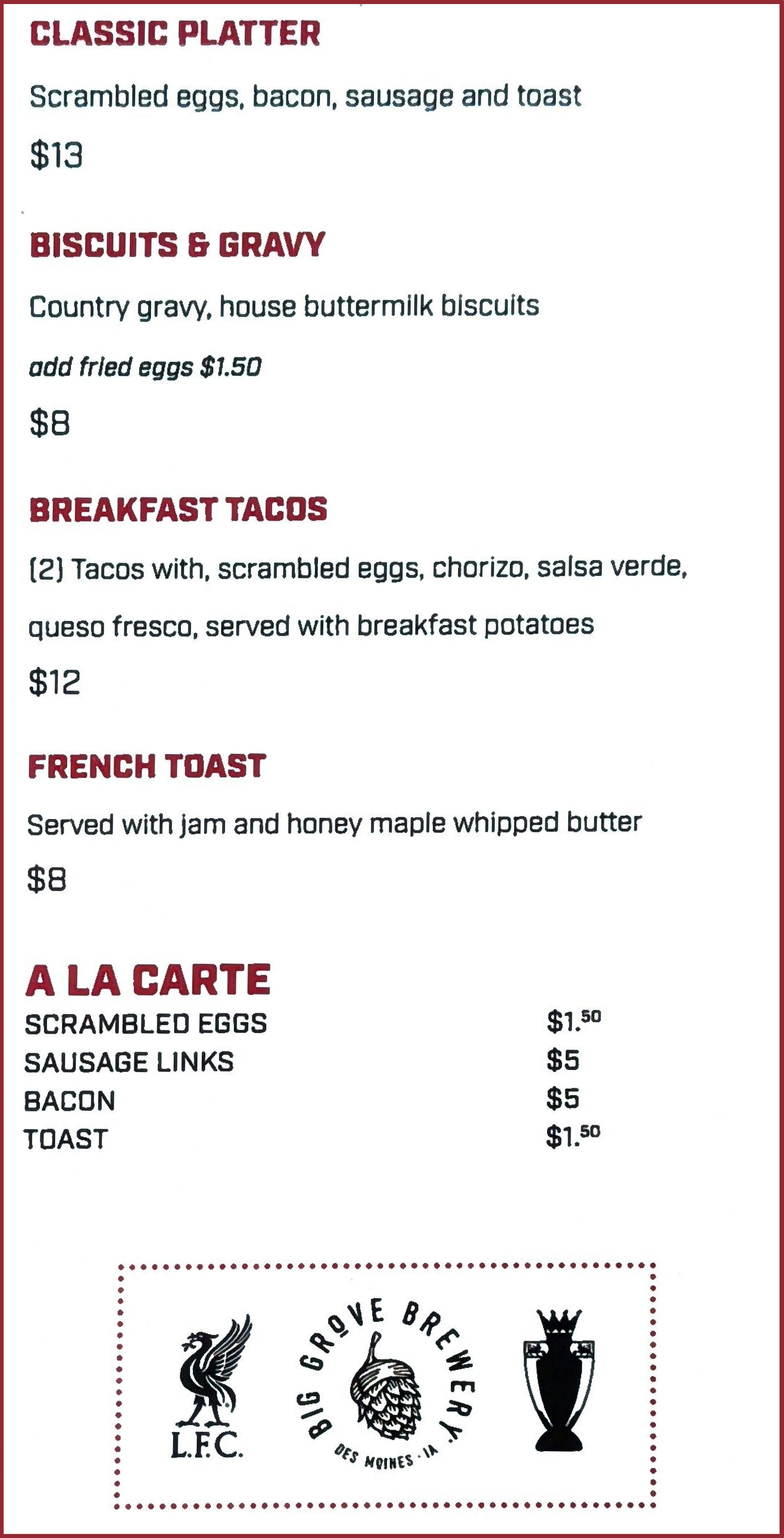 Big Grove has graciously put together a special brunch menu for us. This menu is available at most Saturday/Sunday morning matches.